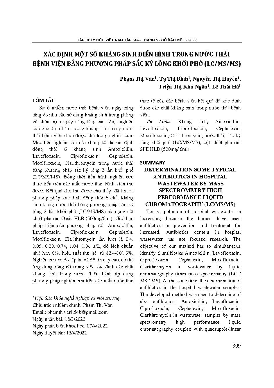 Xác định một số kháng sinh điển hình trong nước thải bệnh viện bằng phương pháp sắc ký lỏng khối phổ (LC/MS/MS) = Determination some typical antibiotics in hospital wastewater by mass spectrometry high performance liquid chromatography (LC/MS/MS)