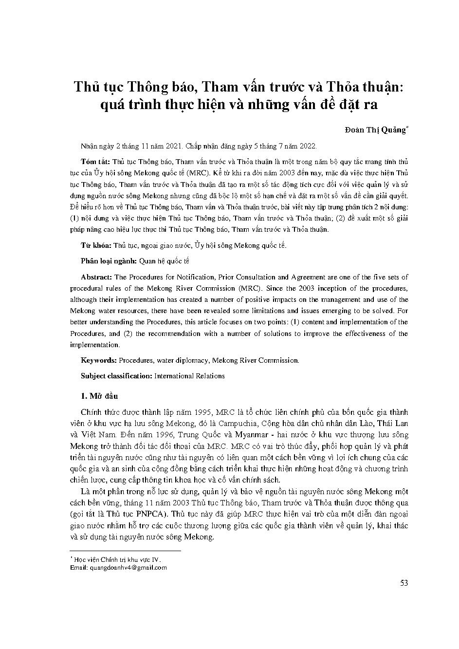 Thủ tục thông báo, tham vấn trước và thỏa thuận: quá trình thực hiện và những vấn đề đặt ra = Procedures for notification, prior consultation and agreement: process of implementation and arising issues