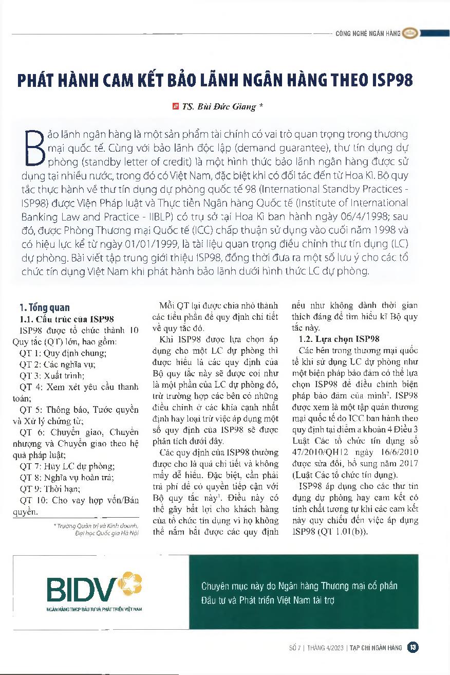 Phát hành cam kết bảo lãnh ngân hàng theo ISP98. = The issuance of bank guarantee commitment following ISP98
