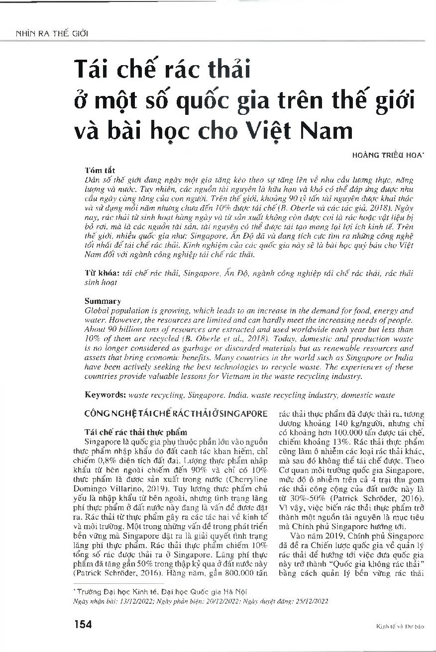Tái chế rác thải ở một số quốc gia trên thế giới và bài học cho Việt Nam = Waste recycling in some countries around the world and lessons for Vietnam