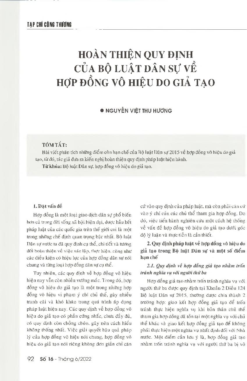 Hoàn thiện quy định của Bộ luật Dân sự về hợp đồng vô hiệu do giả tạo = Improving the Civil Code regulations on the void contract due to forgery