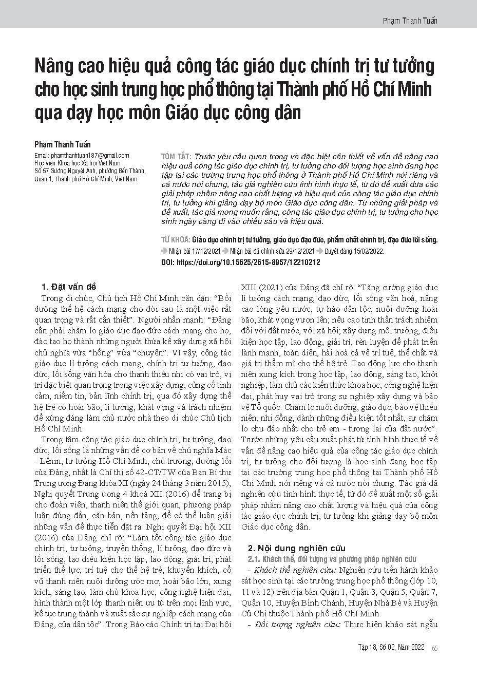 Nâng cao hiệu quả công tác giáo dục chính trị tư tưởng cho học sinh trung học phổ thông tại Thành phố Hồ Chí Minh qua dạy học môn Giáo dục công dân = Improving the effectiveness of political and ideological education for high school students in Ho Chi Min