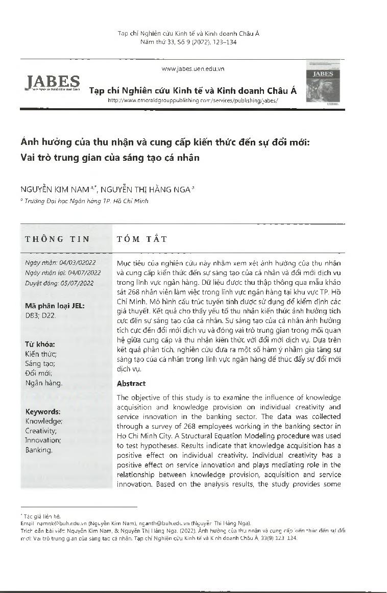 Ảnh hưởng của thu nhận và cung cấp kiến thức đến sự đổi mới: Vai trò trung gian của sáng tạo cá nhân = The Influence of Acquisition and Knowledge Provision on Innovation: The Mediating Role of Personal Creativity