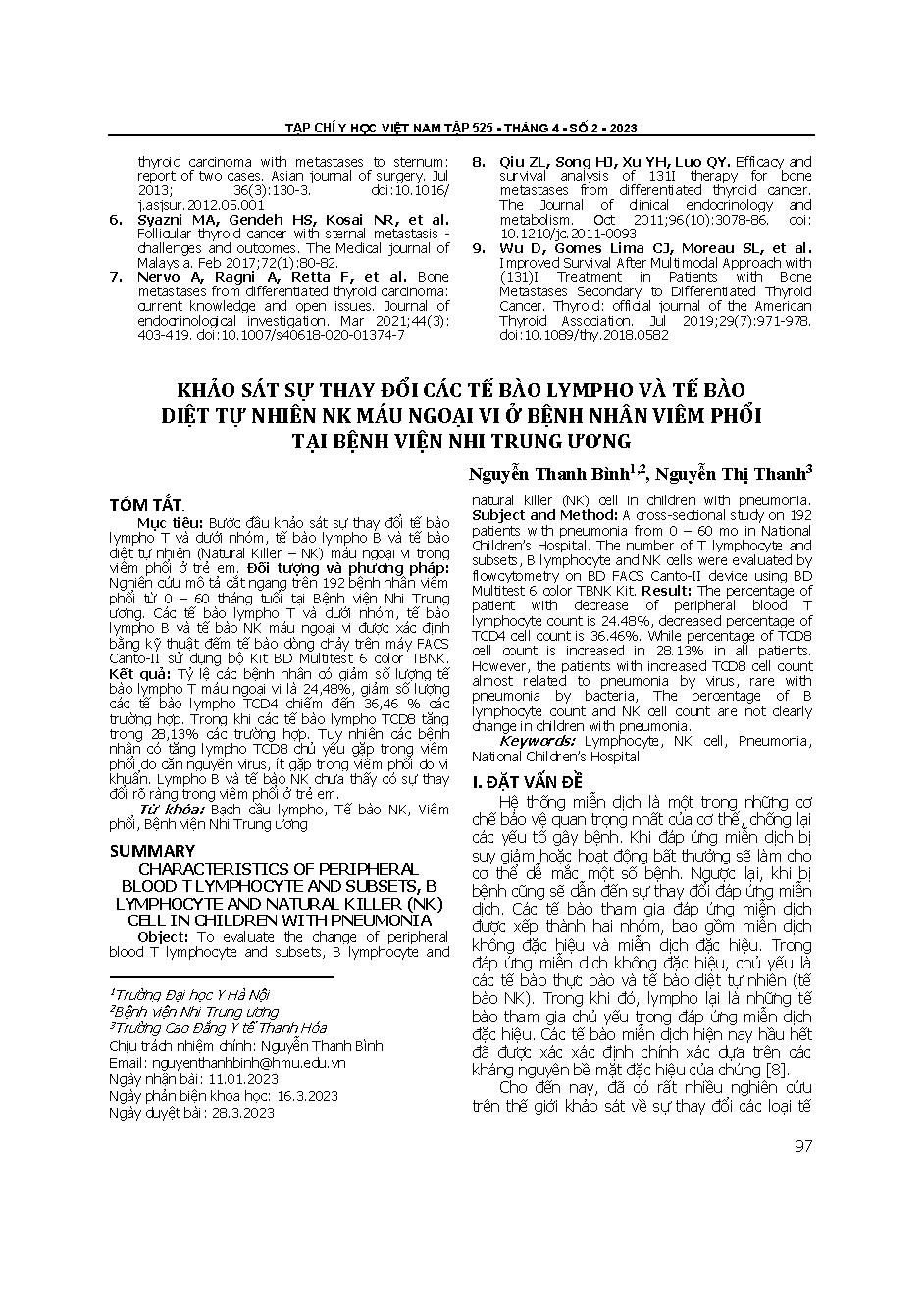 Khảo sát sự thay đổi các tế bào lympho và tế bào diệt tự nhiên NK máu ngoại vi ở bệnh nhân viêm phổi tại Bệnh viện Nhi Trung ương = Characteristics of peripheral blood T lymphocyte and subsets, B lymphocyte and natural killer (NK) cell in children with pn