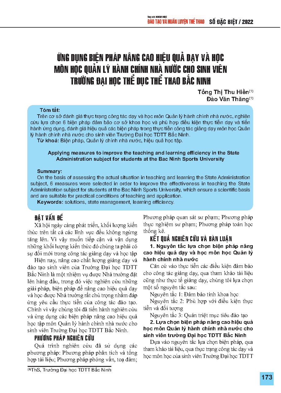 Ứng dụng biện pháp nâng cao hiệu quả dạy và học môn học Quản lý hành chính nhà nước cho sinh viên Trường Đại học Thể dục thể thao Bắc Ninh = Applying measures to improve the teaching and learning efficiency in the State Administration subject for students