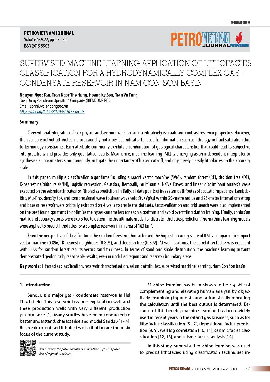 Ứng dụng máy học có giám sát để phân loại các di sản cho một hồ chứa khí - ngưng tụ phức tạp về mặt thủy động lực học ở bể Nam Côn Sơn = Supervised machine learning application of lithofacies classification for a hydrodynamically complex gas - condensate