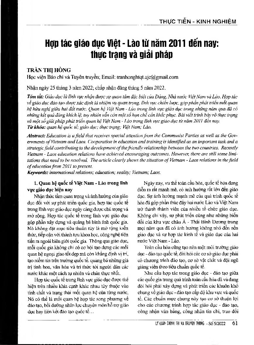 Hợp tác giáo dục Việt - Lào từ năm 2011 đến nay: thực trạng và giải pháp = Vietnam- Laos education cooperation from 2011 to present: reality and solutions