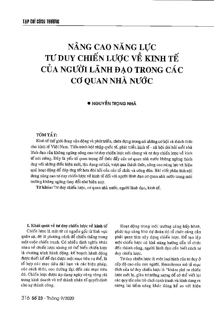 Nâng cao năng lực tư duy chiến lược về kinh tế của người lãnh đạo trong các cơ quan nhà nước = Enhancing the strategic economic thinking for the leaders of state agencies