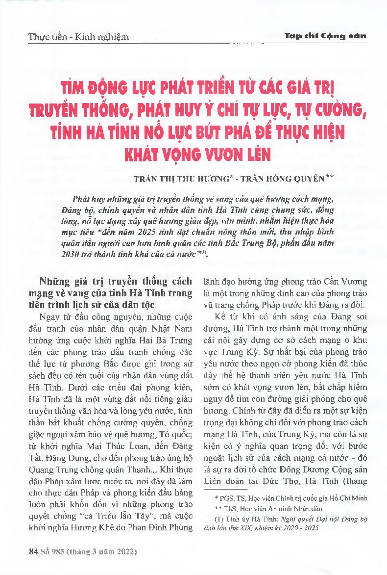 Tìm động lực phát triển từ các giá trị truyền thống, phát huy ý chí tự lực, tự cường, tỉnh Hà Tĩnh nỗ lực bứt phá để thực hiện khát vọng vươn lên = Finding motivation for development from traditional values, promoting self-reliance and self-reliance, Ha T