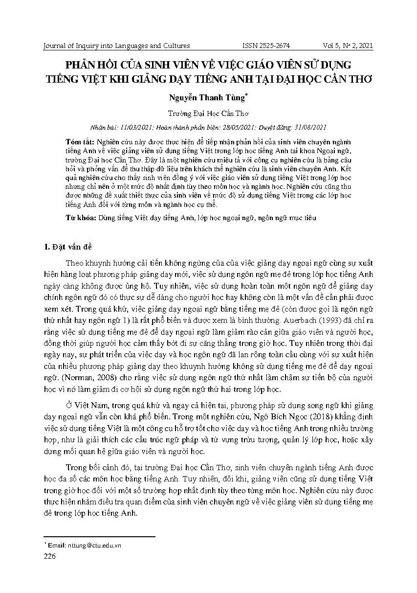 Phản hồi của sinh viên về việc giáo viên sử dụng tiếng Việt khi giảng dạy tiếng anh tại Đại học Cần Thơ = Students’ perceptions on teachers’ use of vietnamese in efl classrooms at Can Tho university