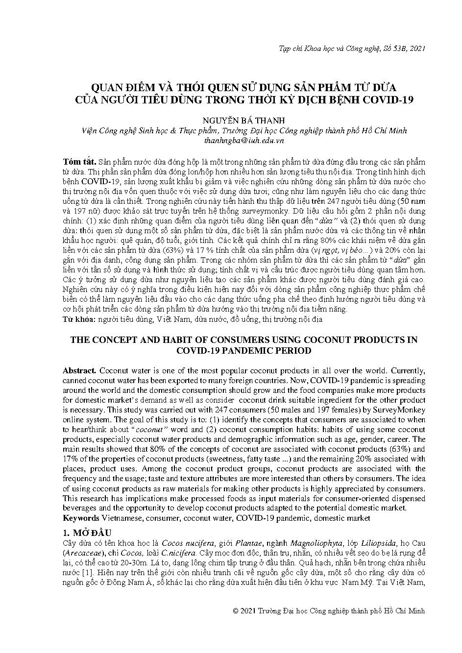 Quan điểm và thói quen sử dụng sản phẩm từ dừa của người tiêu dùng trong thời kỳ dịch bệnh Covid-19