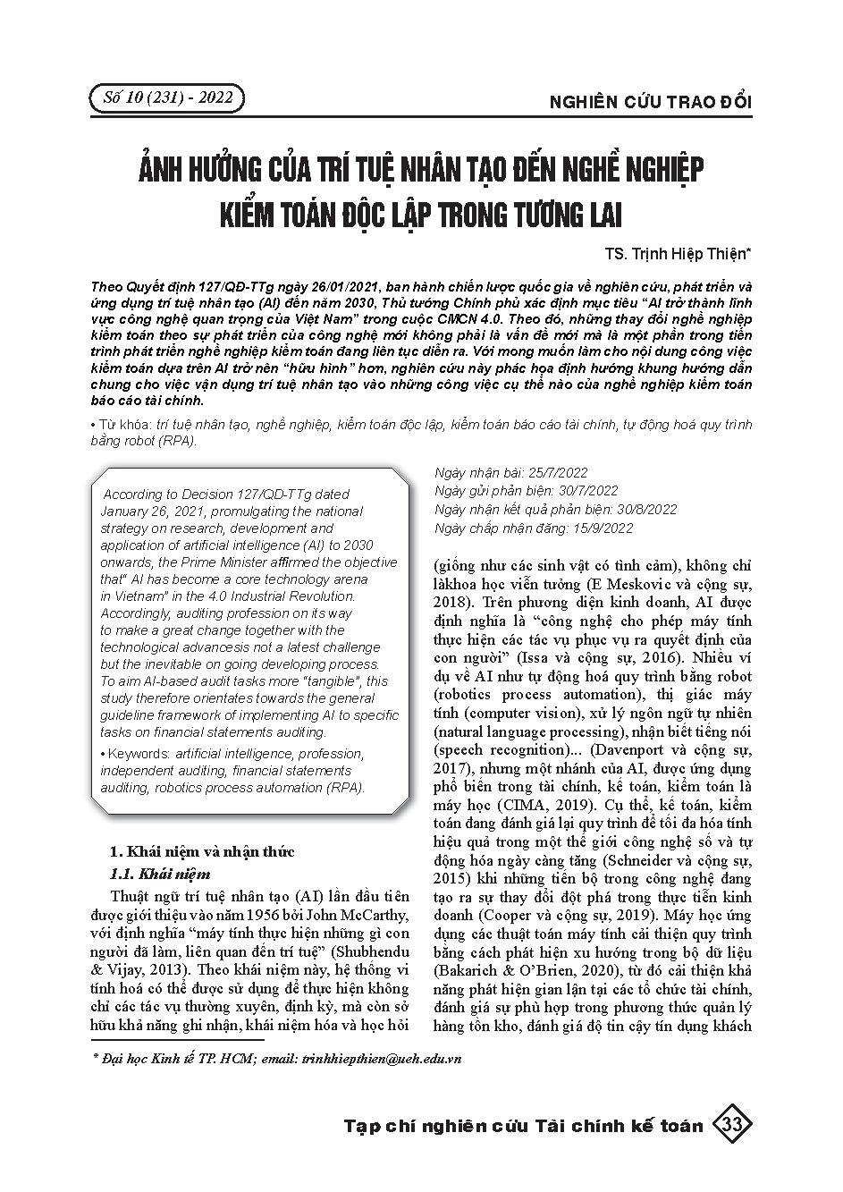 Ảnh hưởng của trí tuệ nhân tạo đến nghề nghiệp kiểm toán độc lập trong tương lai = The impact of artificial intelligence on the future of audit