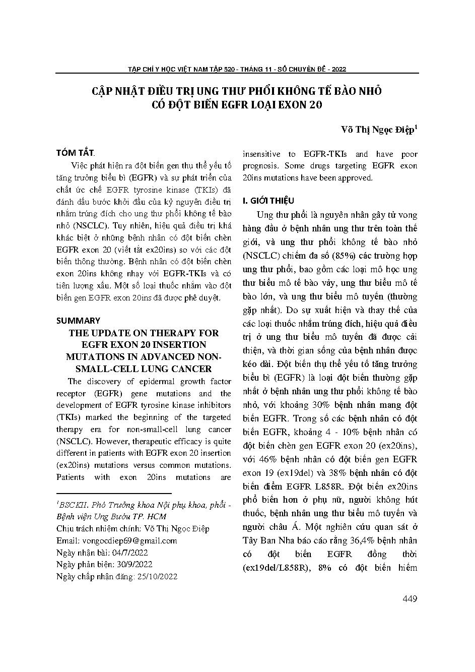 Cập nhật điều trị ung thư phổi không tế bào nhỏ có đột biến EGFR loại exon 20 = The update on therapy for EGFR exon 20 insertion mutations in advanced non-small-cell lung cancer