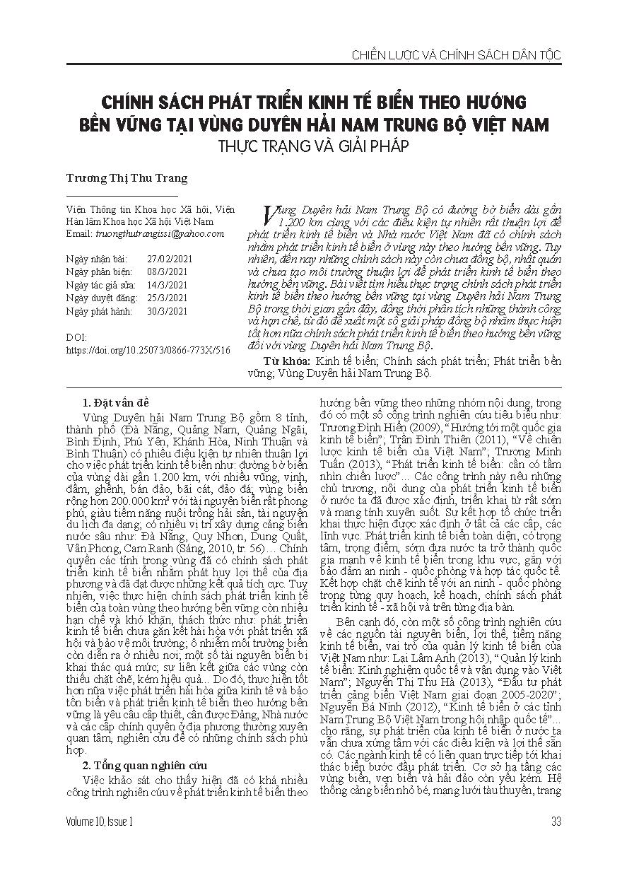 Chính sách phát triển kinh tế biển theo hướng bền vững tại vùng duyên hải nam trung bộ việt nam thực trạng và giải pháp = Policies for sustainable development of marine economy in the south central coast of vietnam situation and solutions