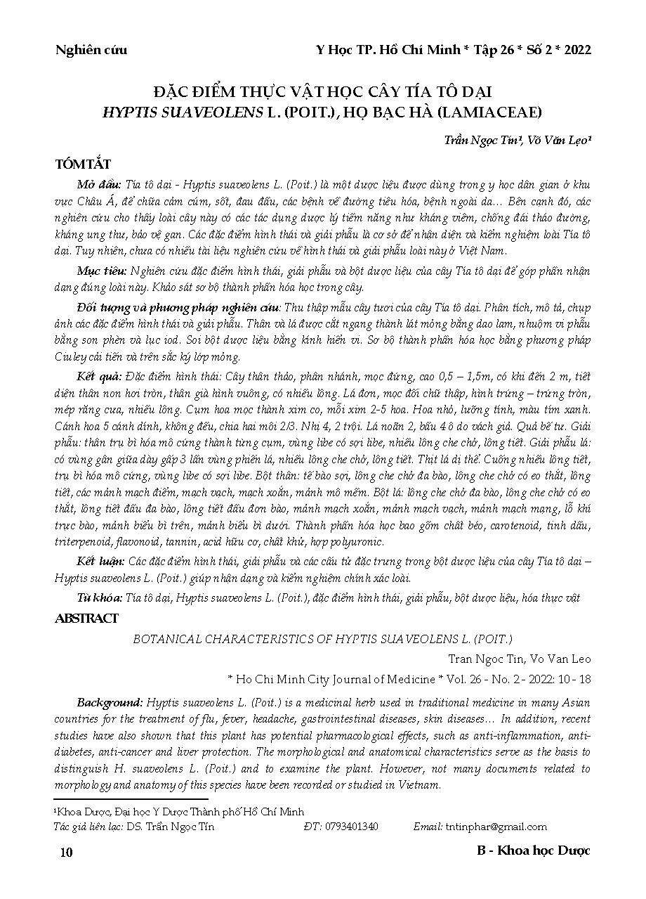 Đặc điểm thực vật học cây tía tô dại Hyptis suaveolens L. (Poit.), họ bạc hà (Lamiaceae) = Botanical characteristics of Hyptis suaveolens L. (Poit.)