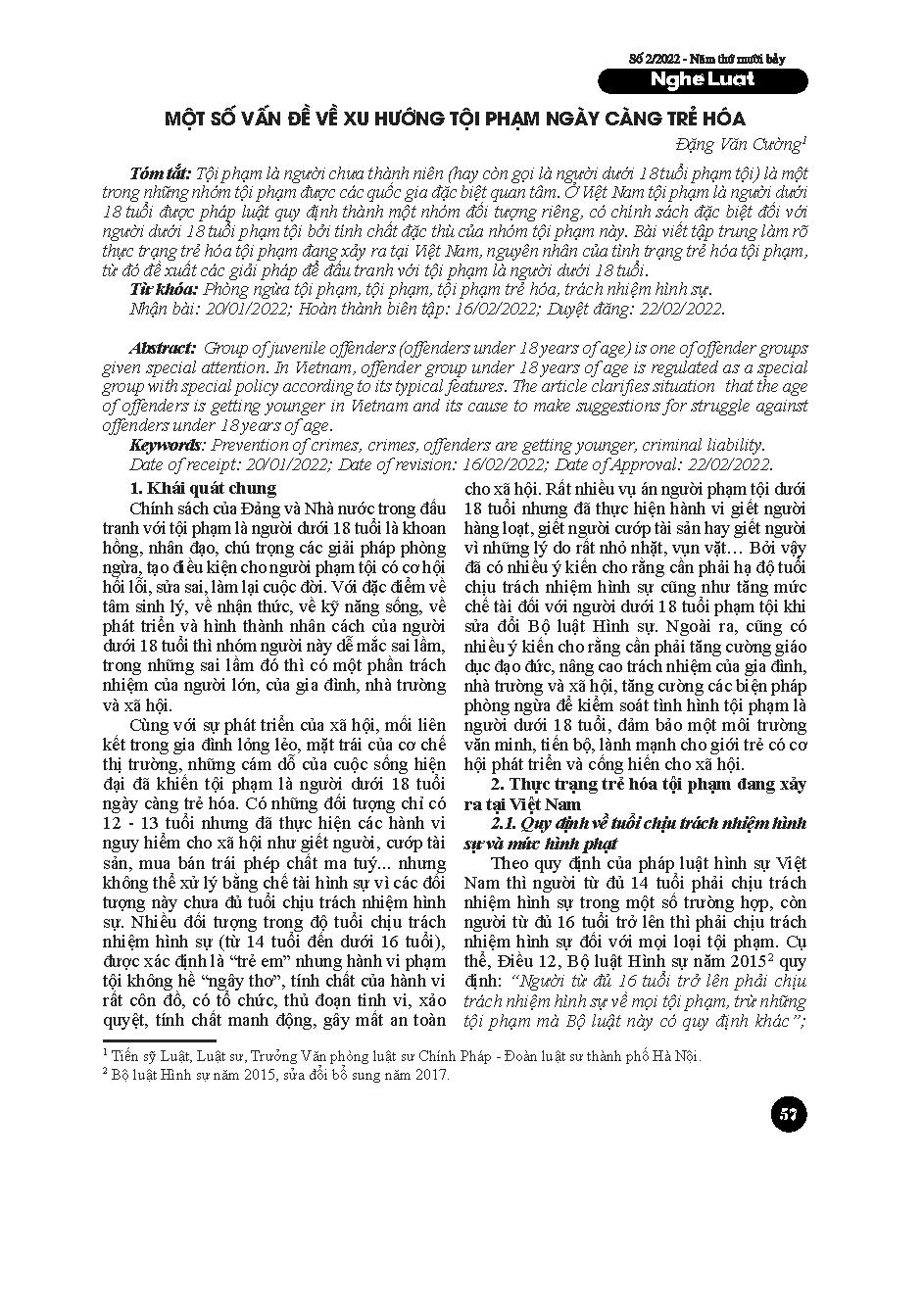 Một sổ vấn đề về xu hướng tội phạm ngày câng trẻ hóa = Some issues on the younger age of offenders