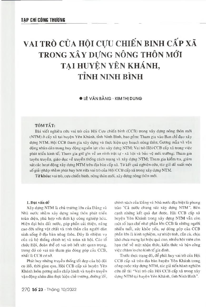 Vai trò của hội cựu chiến binh cấp xã trong xây dựng nông thôn mới tại huyện Yên Khánh, tỉnh Ninh Bình = The role of commune-level veterans associations in the implementation of new-style rural building program in Yen Khanh district, Ninh Binh province