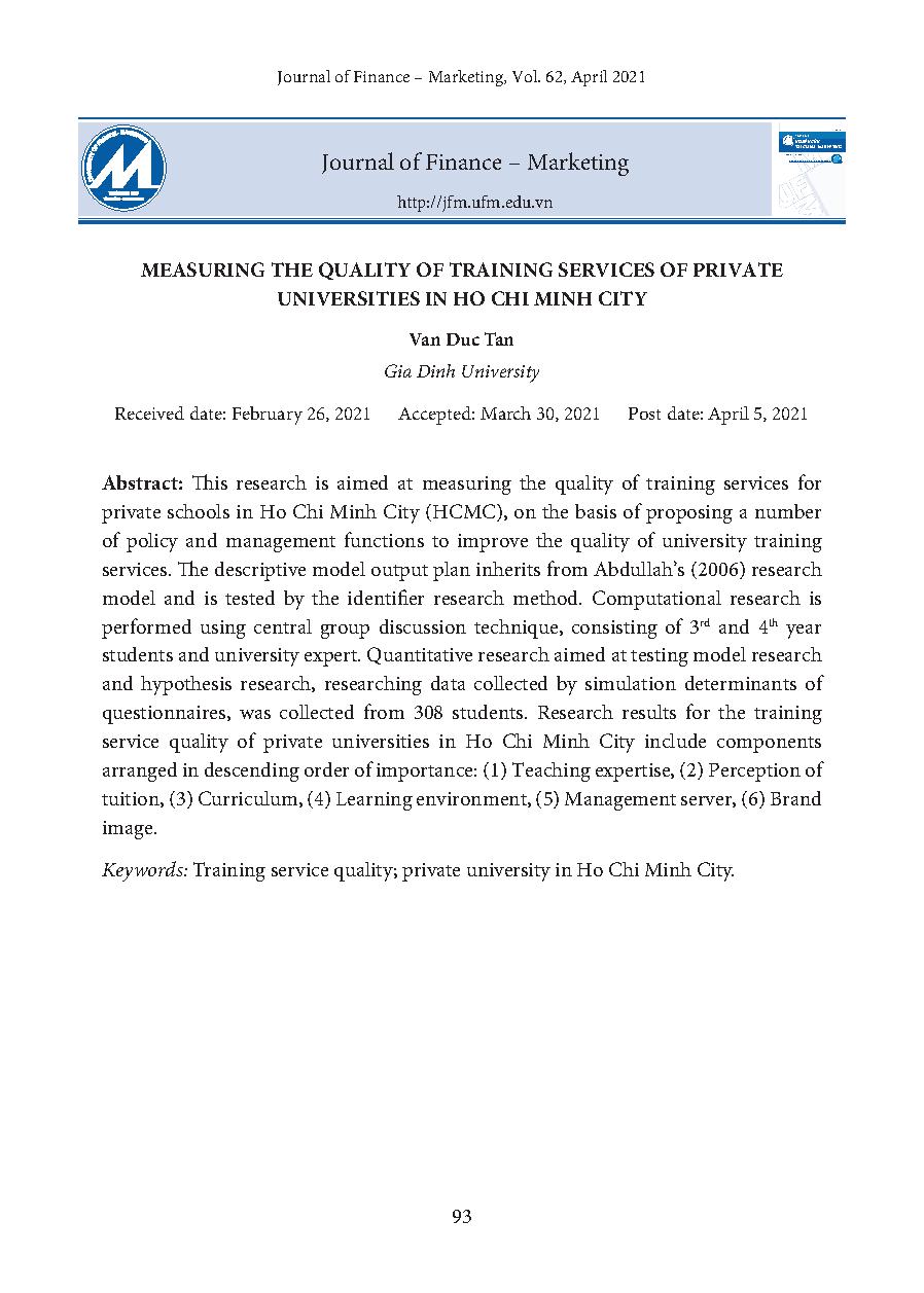 Đo lường các yếu tố ảnh hưởng đến chất lượng dịch vụ đào tạo các trường đại học tư thục trên địa bàn Thành phố Hồ Chí Minh