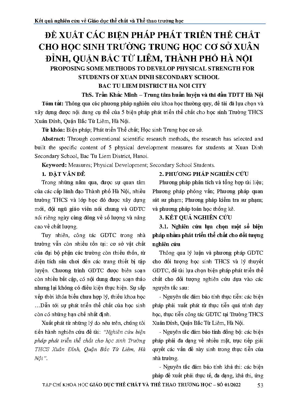 Đề xuất các biện pháp phát triển thể chất cho học sinh trường Trung học cơ sở Xuân Đỉnh, quận Bắc Từ Liêm, thành phố Hà Nội = Proposing some methods to develop physical strength for students of Xuan Dinh secondary school Bac Tu Liem district Ha Noi city