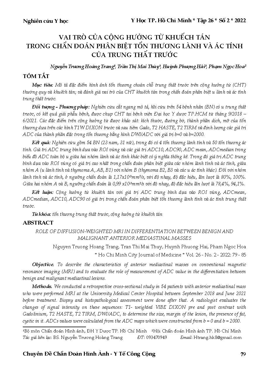 Vai trò của cộng hưởng từ khuếch tán trong chẩn đoán phân biệt tổn thương lành và ác tính của trung thất trước