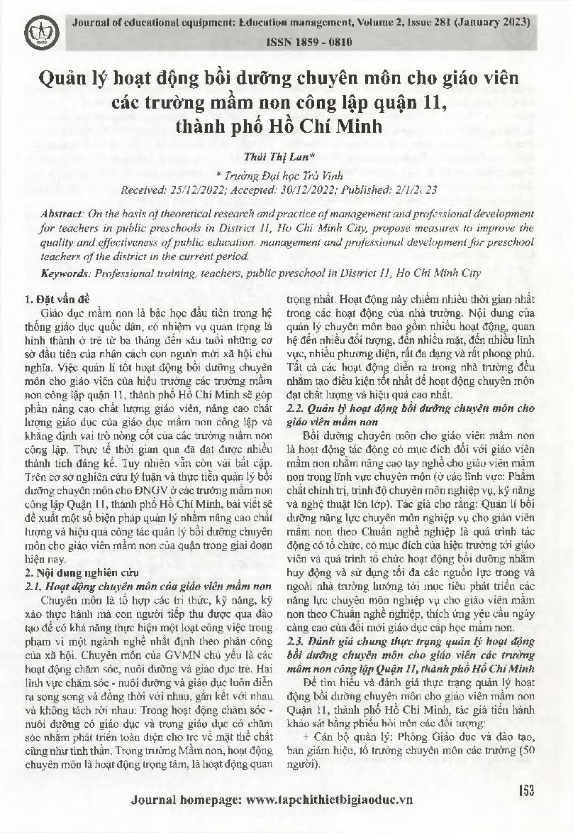 Quản lý hoạt động bồi dưỡng chuyên môn cho giáo viên các trường mầm non công lập quận 11, thành phố Hồ Chí Minh = Managing professional development activities for teachers of public preschools in District 11, Ho Chi Minh City
