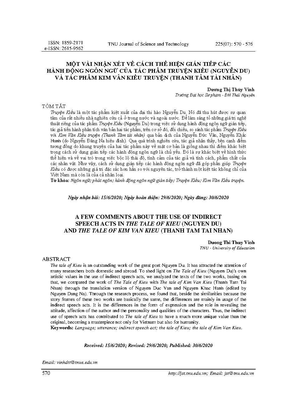 MỘT VÀI NHẬN XÉT VỀ CÁCH THỂ HIỆN GIÁN TIẾP CÁC HÀNH ĐỘNG NGÔN NGỮ CỦA TÁC PHẨM TRUYỆN KIỀU (NGUYỄN DU) VÀ TÁC PHẨM KIM VÂN KIỀU TRUYỆN (THANH TÂM TÀI NHÂN) = A FEW COMMENTS ABOUT THE USE OF INDIRECT SPEECH ACTS IN THE TALE OF KIEU (NGUYEN DU) AND THE TALE OF KIM VAN KIEU (THANH TAM TAI NHAN)