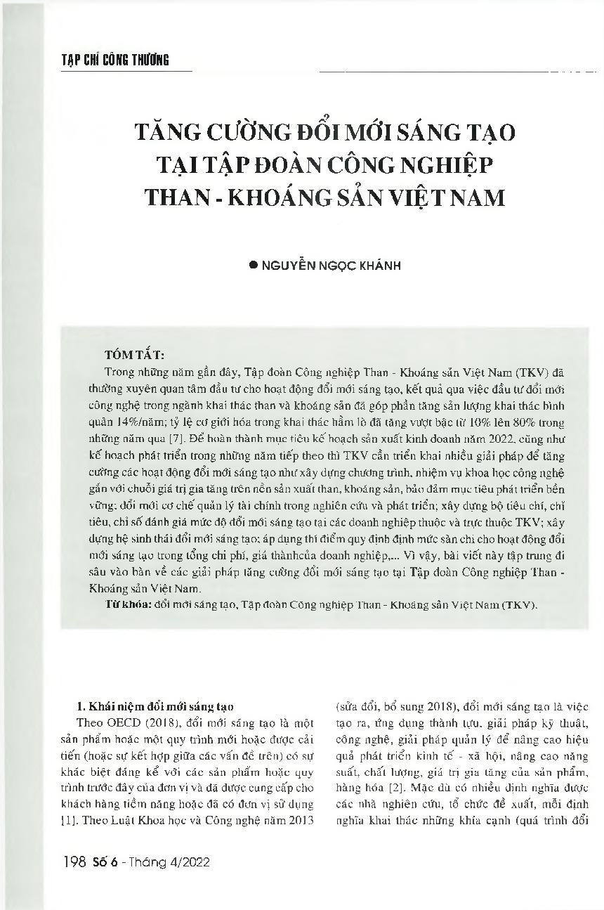 Tăng cường đổi mới sáng tạo tại Tập đoàn công nghiệp Than - Khoáng sản Việt Nam = Enhancing innovation activities of Vietnam National Coal - Mineral Industries Holding Corporation Limited