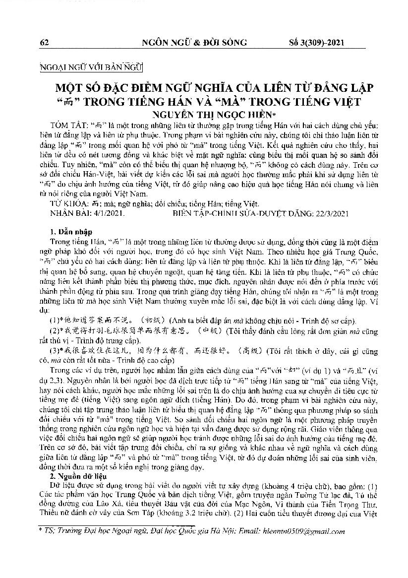 Một số đặc điểm ngữ nghĩa của liên từ đẳng lập trong tiếng Hán và “mà” trong tiếng Việt