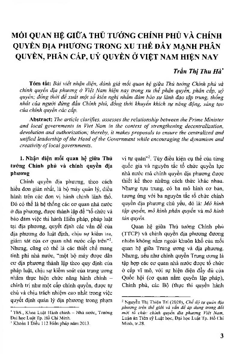 Mối quan hệ giữa thủ tướng chính phủ và chính quyền địa phương trong xu thế đẩy mạnh phân quyền, phân cấp, uỷ quyền ở Việt Nam hiện nay = The Relationship between the Prime Minister and Local Governments in the Context of Strengthening Decentralization, D