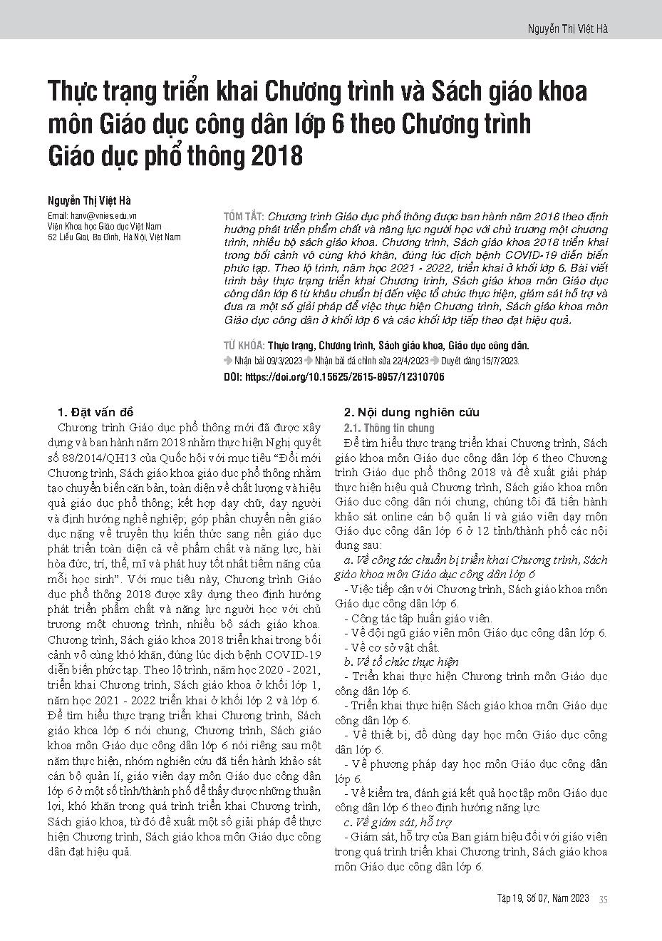 Thực trạng triển khai Chương trình và Sách giáo khoa môn Giáo dục công dân lớp 6 theo Chương trình Giáo dục phổ thông 2018 = Current status of implementing the curriculum and textbooks of the 6th grade citizenship education in the new general education cu
