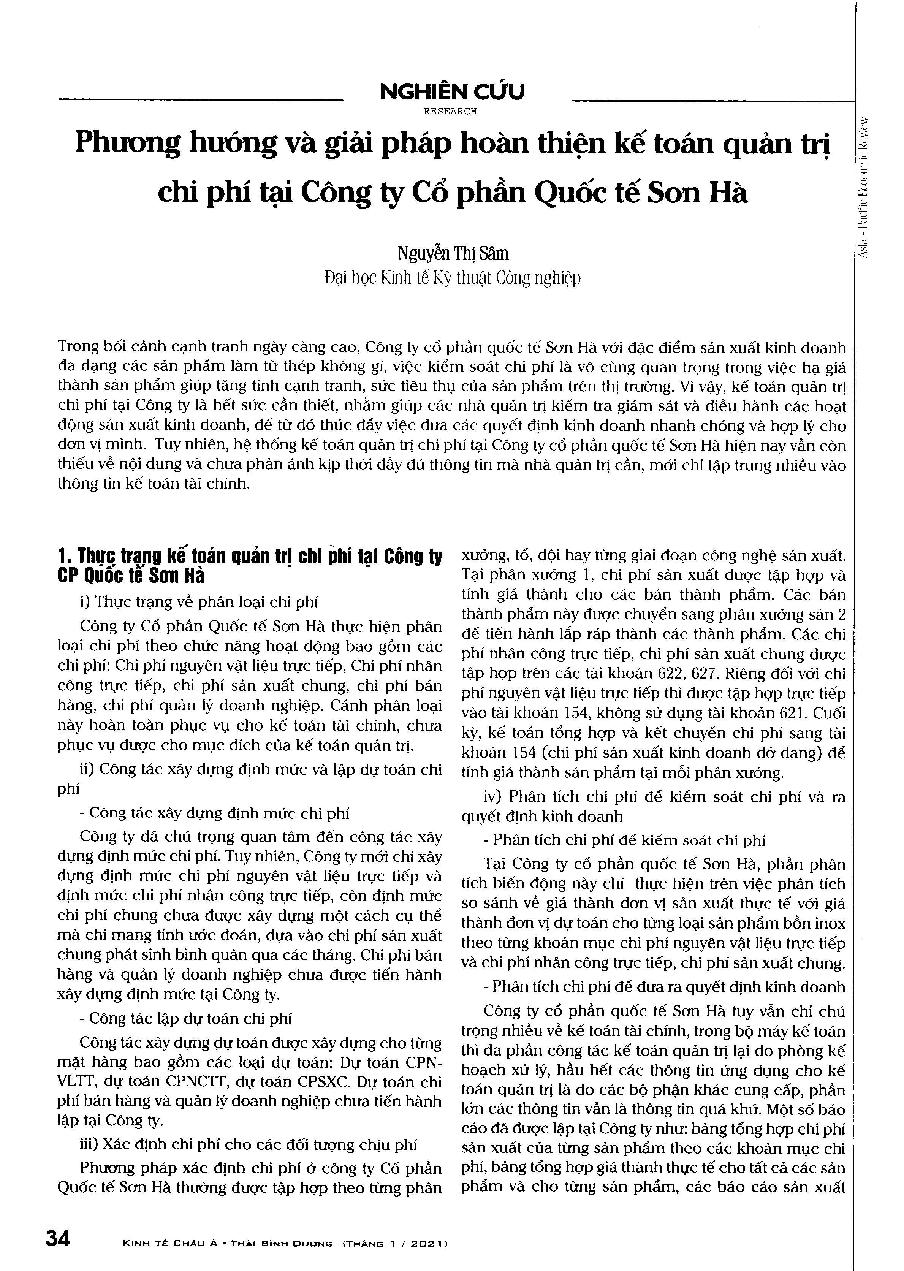 Phương hướng và giải pháp hoàn thiện kế toán quản trị chi phí tại Công ty Cổ phần Quốc tế Sơn Hà