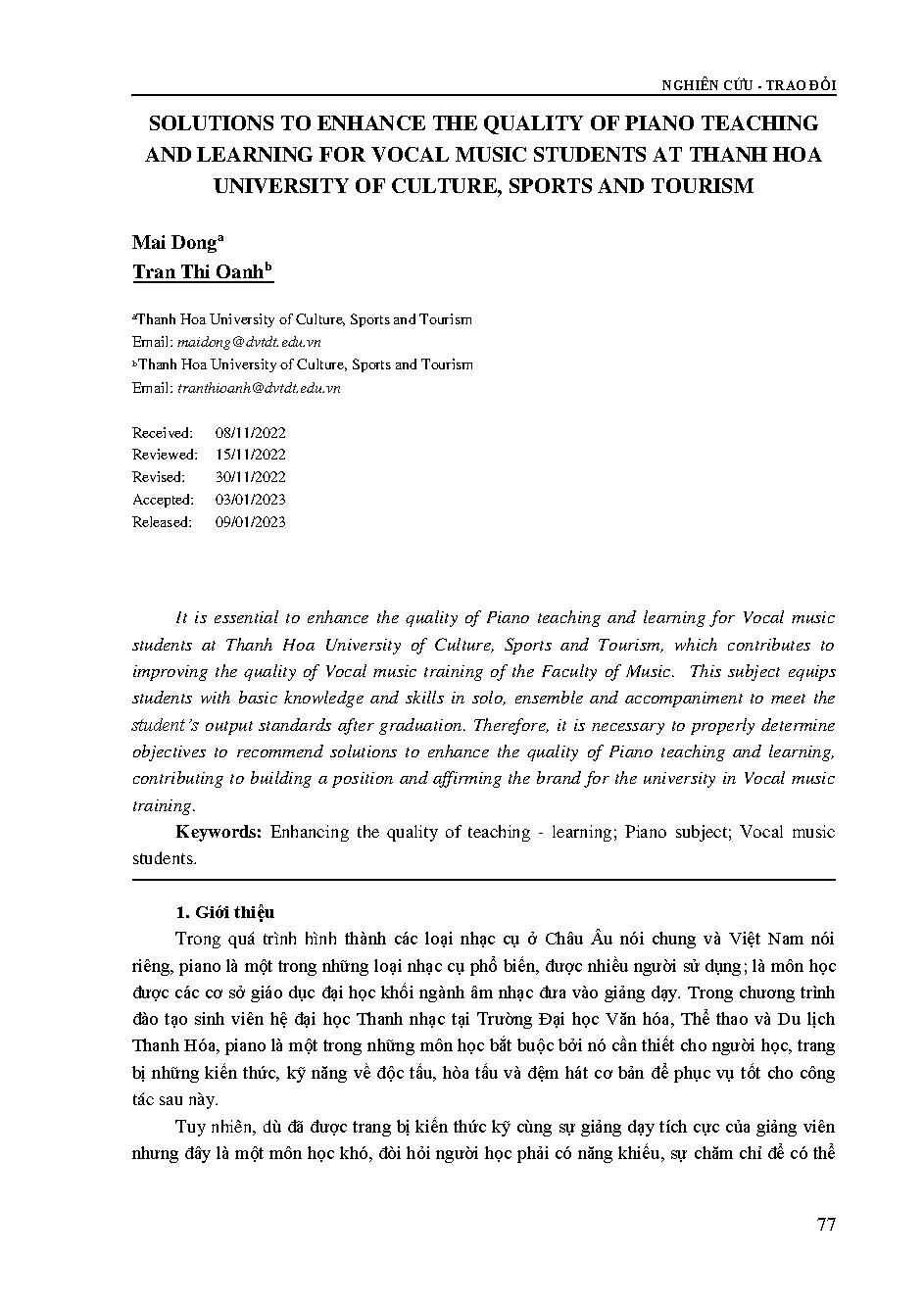 Giải pháp nâng cao chất lượng dạy và học môn piano cho sinh viên đại học thanh nhạc, trường Đại học Văn hóa, Thể thao và Du lịch Thanh Hóa = Solutions to enhance the quality of piano teaching and learning for vocal music students at Thanh Hoa University o