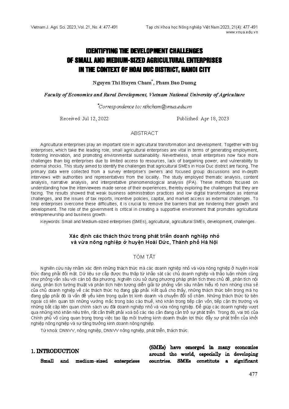 Xác định các thách thức trong phát triển doanh nghiệp nhỏ và vừa nông nghiệp ở huyện Hoài Đức, Thành phố Hà Nội