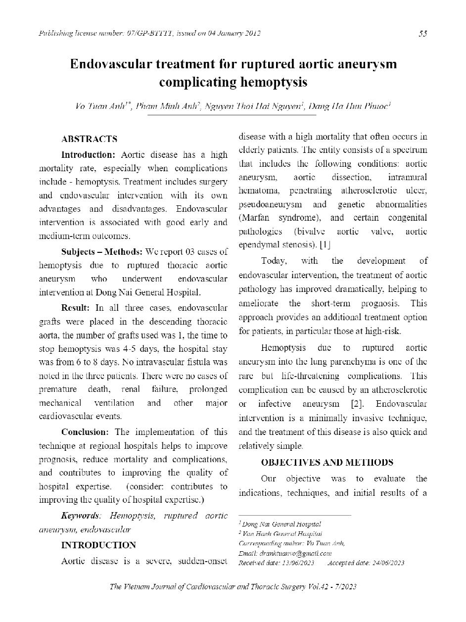 Điều trị nội mạch cho vỡ phình động mạch chủ gây ho ra máu = Endovascular treatment for ruptured aortic aneurysm complicating hemoptysis