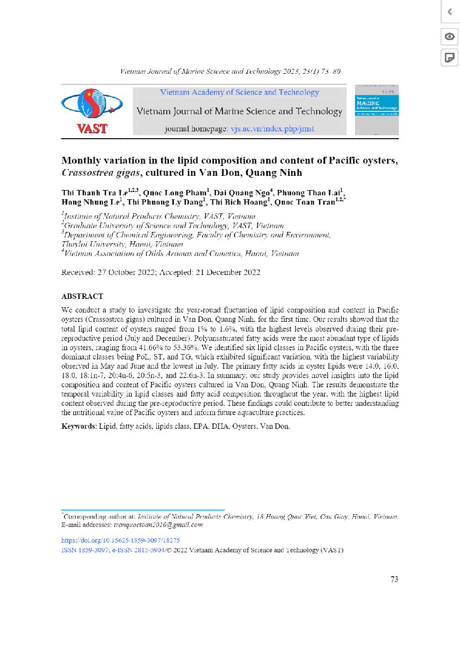 Biến động hàng tháng về thành phần và hàm lượng lipid của hàu Thái Bình Dương Crassostrea gigas nuôi tại Vân Đồn, Quảng Ninh = Monthly variation in the lipid composition and content of Pacific oysters, Crassostrea gigas, cultured in Van Don, Quang Ninh