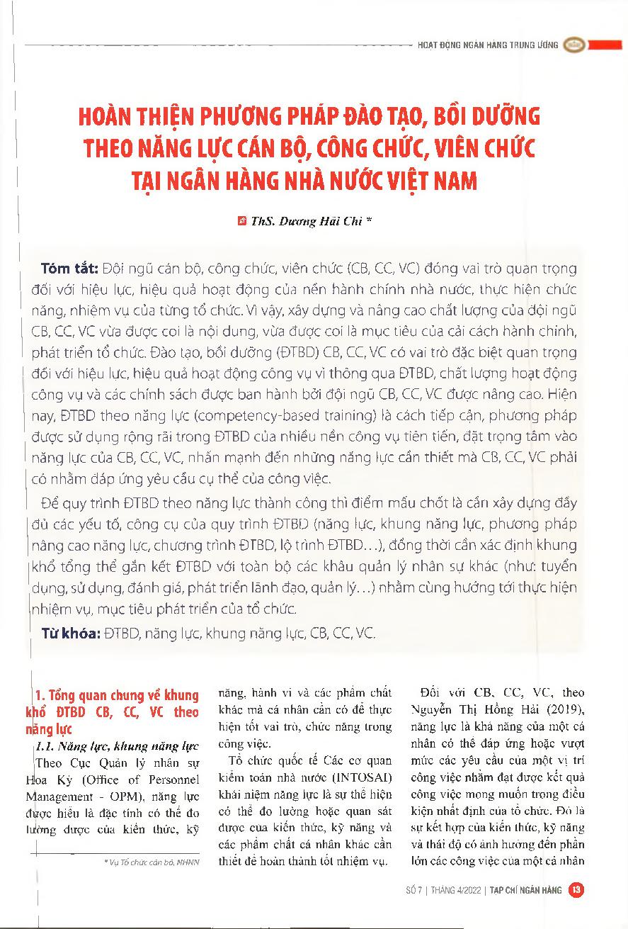 Hoàn thiện phương pháp đào tạo, bồi dưỡng theo năng lực cán bộ, công chức, viên chức tại Ngân hàng Nhà nước Việt Nam = Completing training and retraining methods according to the capacity of cadres, civil servants and public employees at the State Bank of