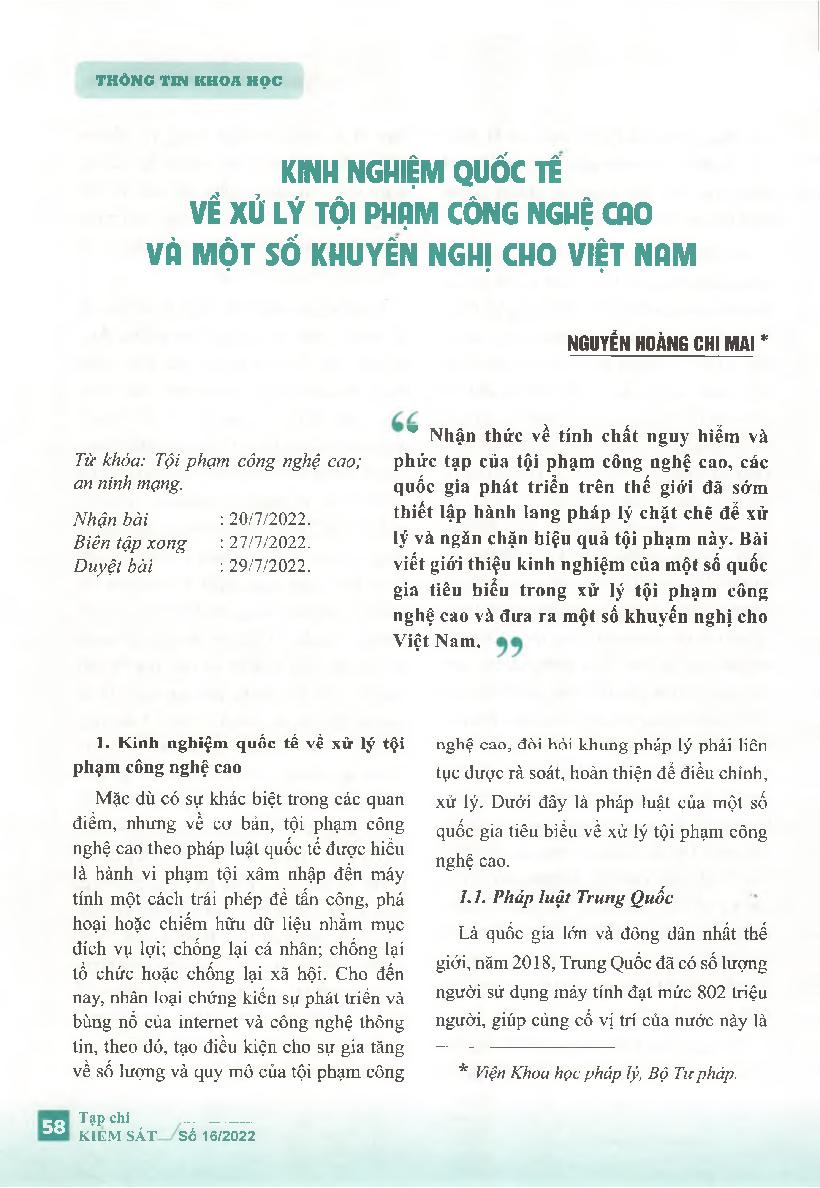 Kinh nghiệm quốc tế về xử lý tội phạm công nghệ cao và một số khuyến nghị cho Việt Nam