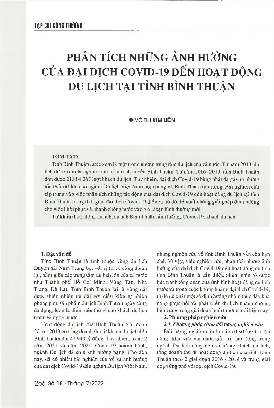 Phân tích những ảnh hưởng của đại dịch Covid-19 đến hoạt động du lịch tại tỉnh Bình Thuận = Analyzing the impacts of Covid-19 pandemic on Binh Thuan province tourism industry