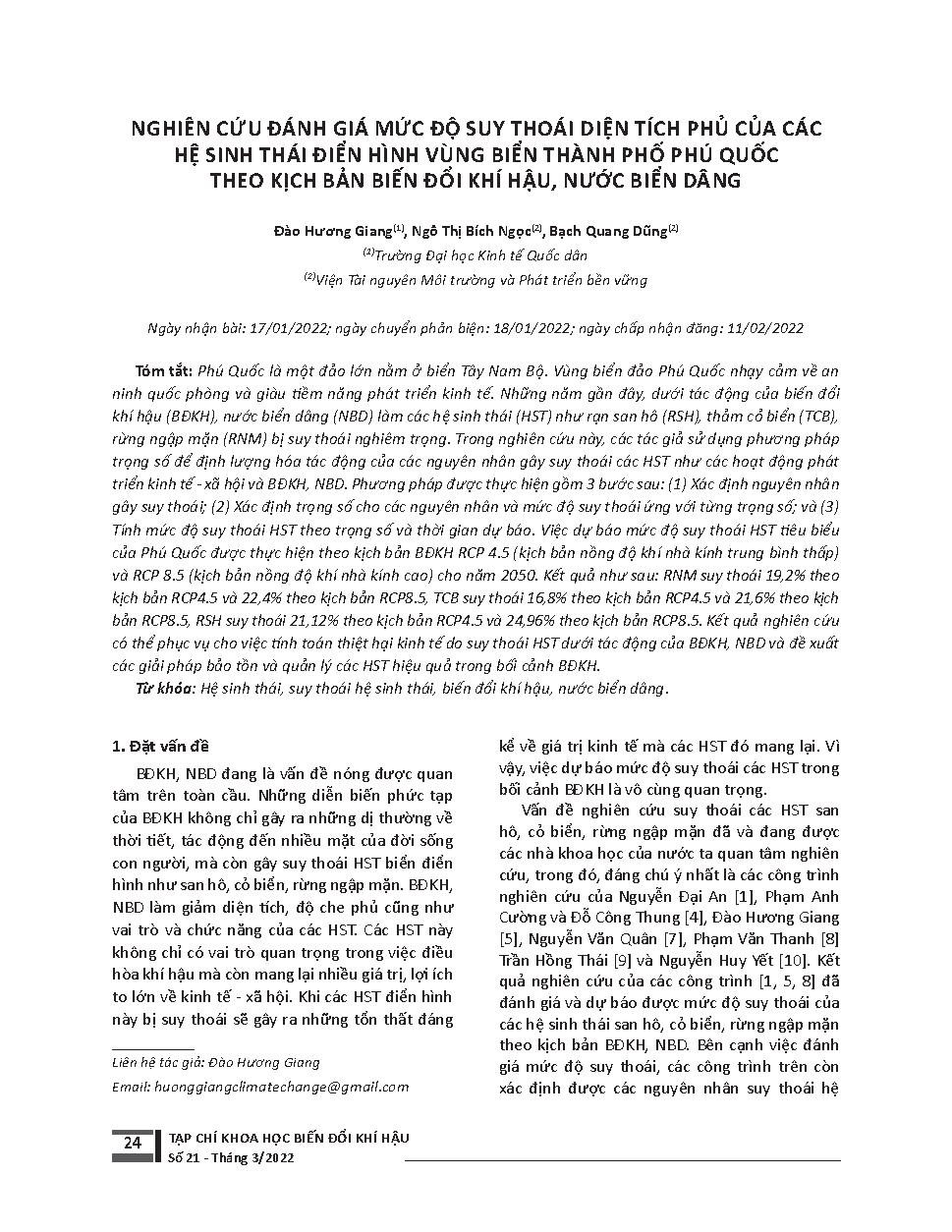 Nghiên cứu đánh giá mức độ suy thoái diện tích phủ của các hệ sinh thái điển hình biển Phú Quốc theo kịch bản biến đổi khí hậu, nước biển dâng = Research on assessment of the decrease in the coverage of typical ecosystems in territorial sea of Phu Quoc ci