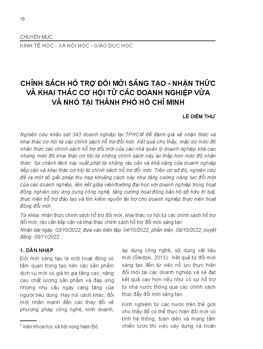 Chính sách hỗ trợ đổi mới sáng tạo - nhận thức và khai thác cơ hội từ các doanh nghiệp vừa và nhỏ tại Thành phố Hồ Chí Minh = Supporting policies for innovation and creativity- awareness and exploiting opportunities from small and medium enterprises in Ho