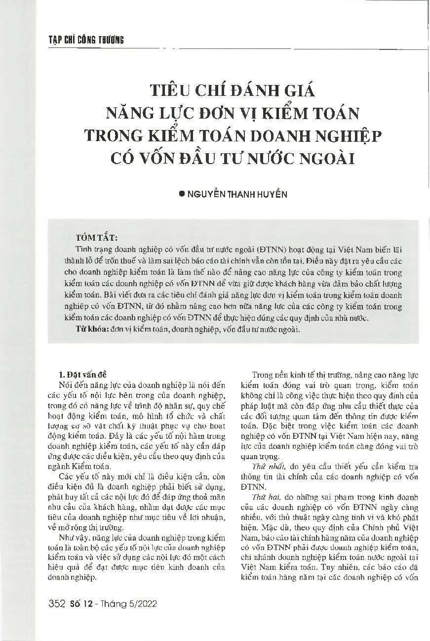 Tiêu chí đánh giá năng lực đơn vị kiểm toán trong kiểm toán doanh nghiệp có vốn đầu tư nước ngoài = Criteria for assessing the capacity of auditing firms when they audit foreign-invested enterprises