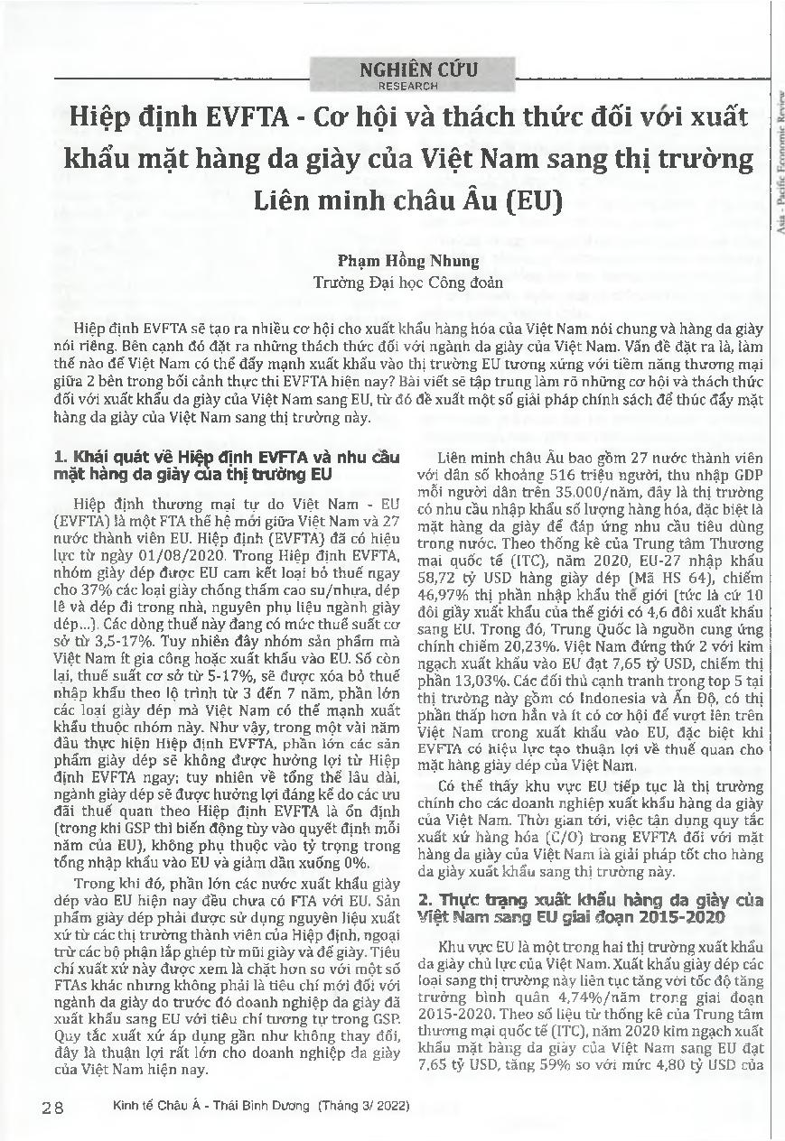 Hiệp định EVFTA - Cơ hội và thách thức đối với xuất khẩu mặt hàng da giày của Việt Nam sang thị trường Liên minh châu Âu (EU)
