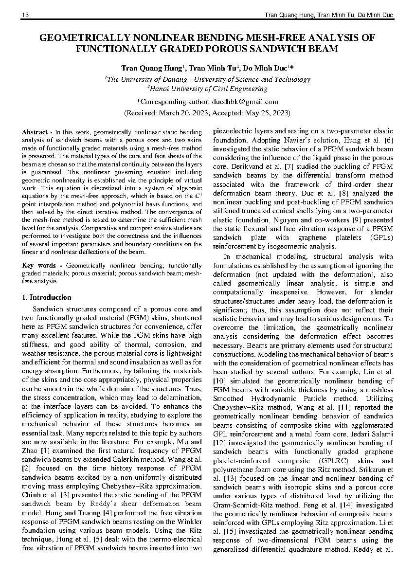 Phân tích không có lưới uốn phi tuyến hình học của chùm bánh sandwich xốp được phân loại theo chức năng = Geometrically nonlinear bending mesh-free analysis of functionally graded porous sandwich beam