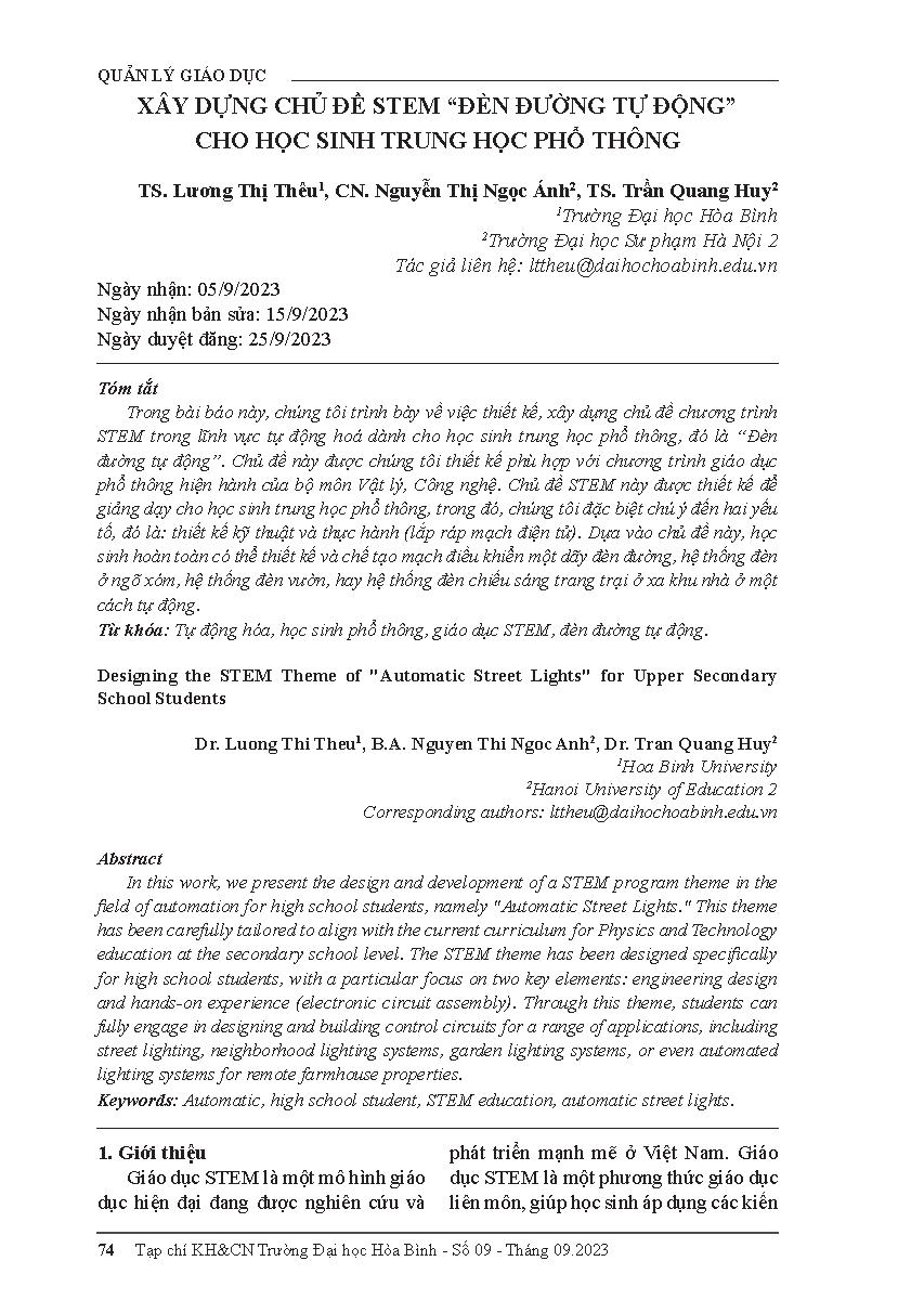 Xây dựng chủ đề Stem "Đèn đường tự động" cho học sinh trung học phổ thông = Designing the STEM theme of "Automatic Street Lights" for upper secondary school students