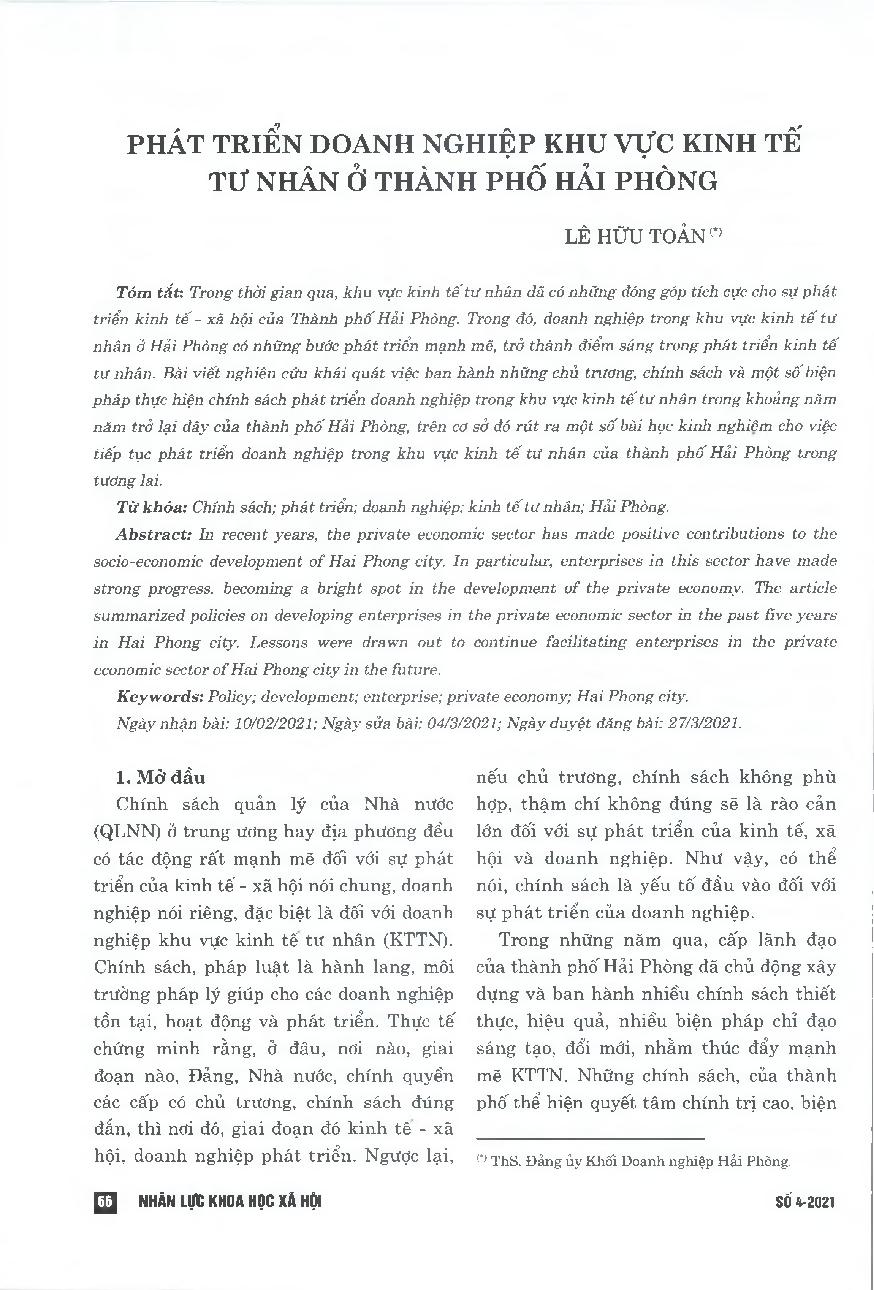 Phát triển doanh nghiệp khu vực kinh tế tư nhân ở thành phố Hải Phòng = Developing private sector enterprises in Hai Phong city