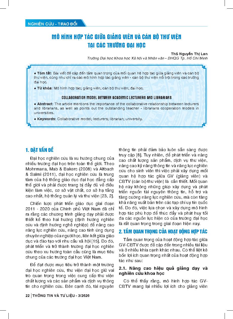 Mô hình hợp tác giữa giảng viên và cán bộ thư viện tại các trường đại học = Collaboration model between academic lecturers and librarians