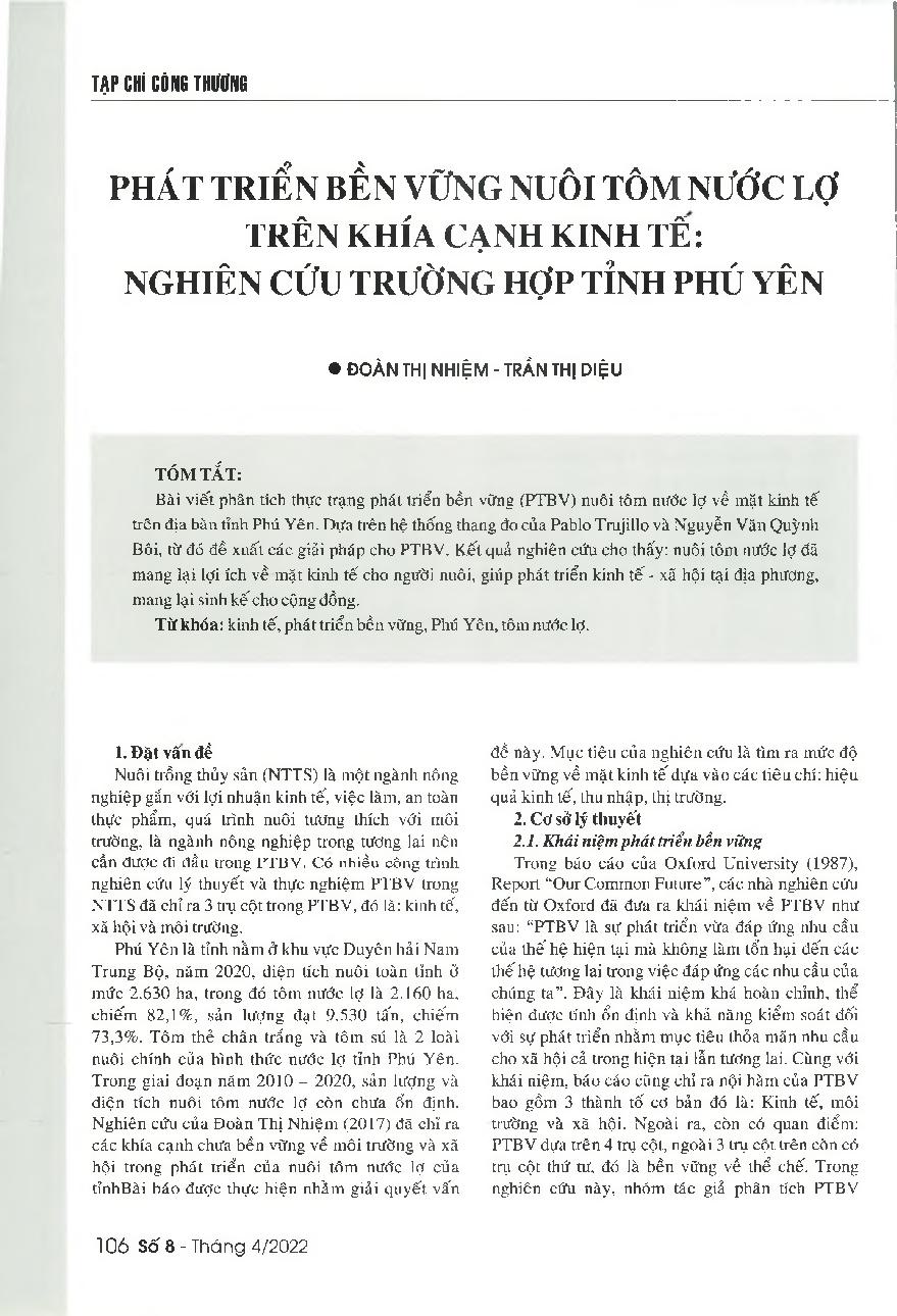 Phát triển bền vững nuôi tôm nước lợ trên khía cạnh kinh tế: Nghiên cứu trường hợp tỉnh Phú Yên = The sustainable development of brackish shrimp in terms of economic benefits: A case study in Phu Yen province