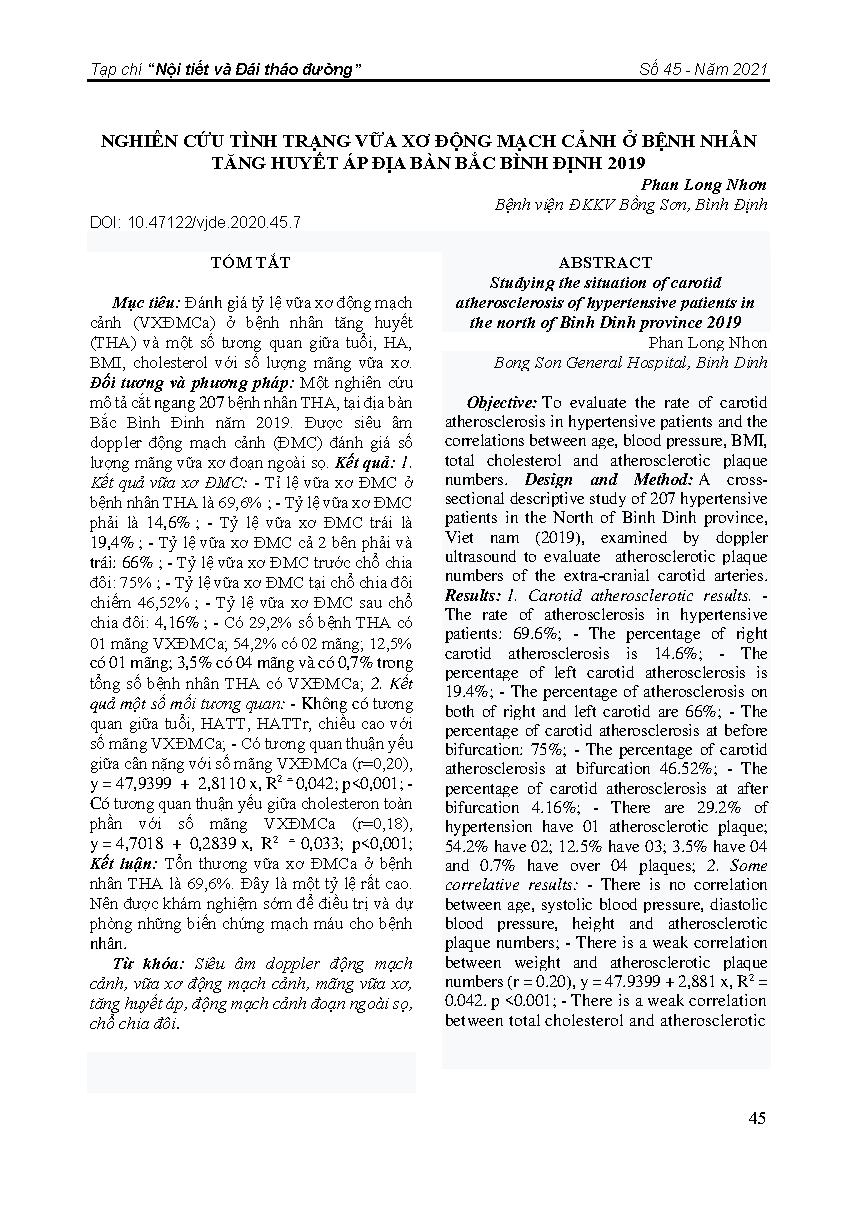 Nghiên cứu tình trạng vữa xơ động mạch cảnh ở bệnh nhân tăng huyết áp địa bàn Bắc Bình Định 2019 = Studying the situation of carotid atherosclerosis of hypertensive patients in the north of Binh Dinh province 2019