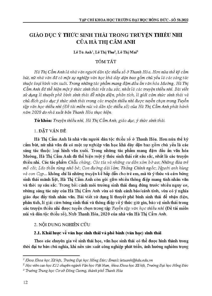 Giáo dục ý thức sinh thái trong truyện thiếu nhi của Hà Thị Cẩm Anh = Eco-consciousness education in children’s story by Ha Thi Cam Anh