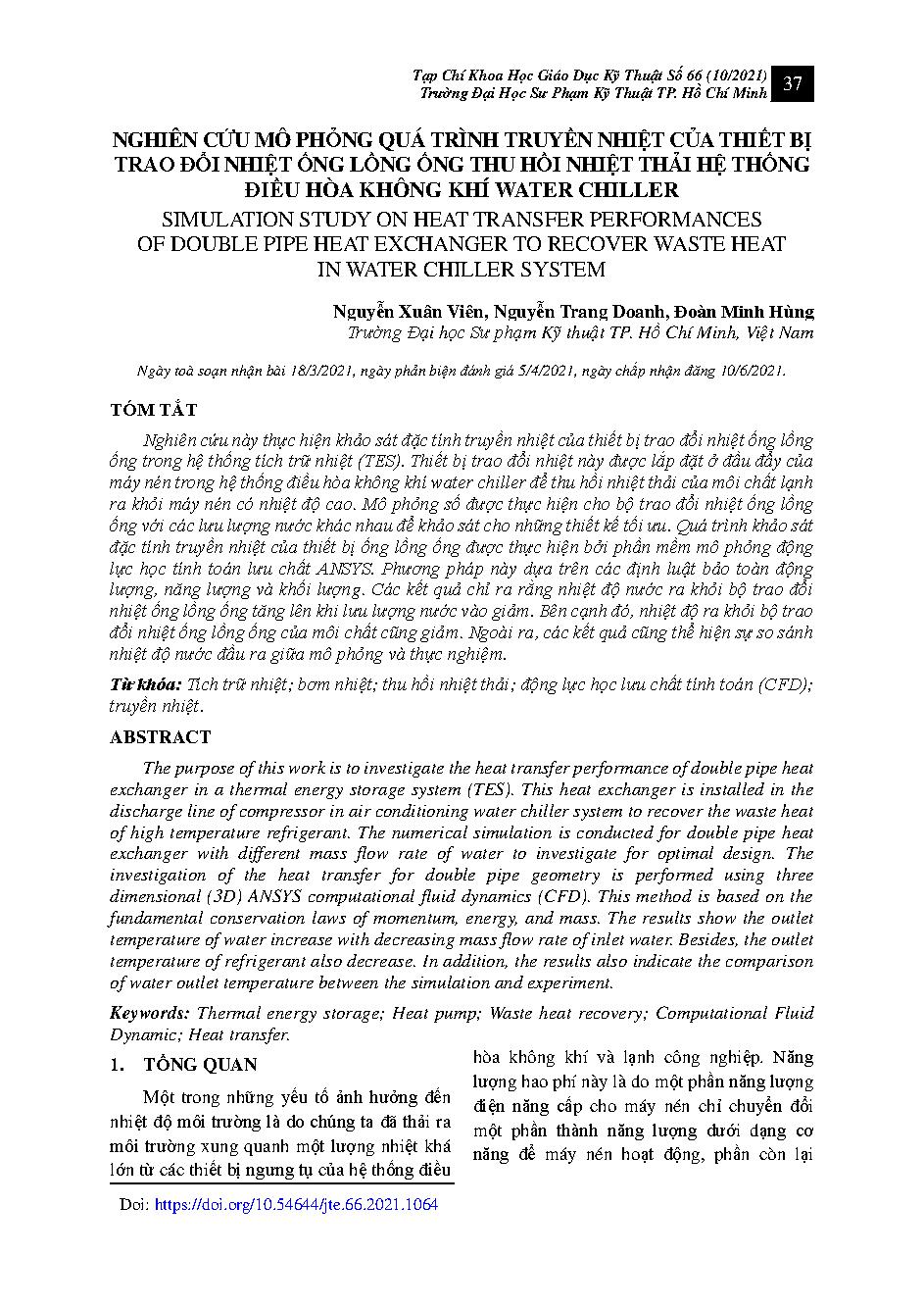 Nghiên cứu mô phỏng quá trình truyền nhiệt của thiết bị trao đổi nhiệt ống lồng ống thu hồi nhiệt thải hệ thống điều hòa không khí water chiller